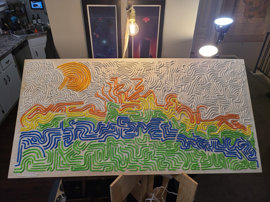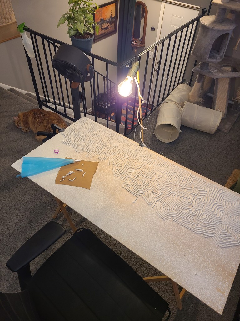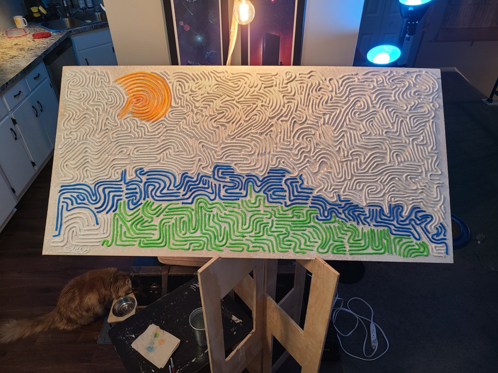 I certainly don’t know much about painting or color theory. I pick colors that I like. This was a tedious process of painting individual lines. This was the first attempt of painting rather than dying. I used a chisel brush that was able to wrap around the lines well. I didn’t want to get too close to the surface, but I didn’t want too much of the line’s white to show either. I was using acrylic paint which was fine for the job, but it applies thin and being water based, needs a couple of layers. The water based paint also softens the gypsum to the point being able to erode. By the end of painting, the brush has a lot of gypsum mixed into the bristles.