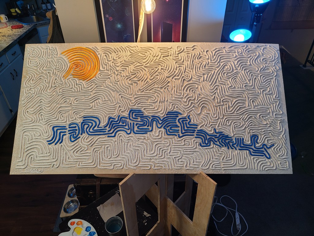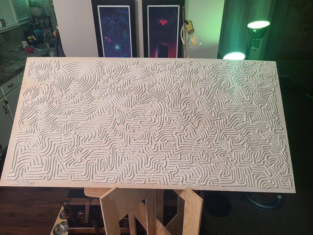 There was a lot to take away from working on this, outside of the artistic elements. The technical details for the setup and work surface would be very important moving forward. This piece had no backing which made it difficult to hang after finishing. I would eventually start prepping the boards much more than what I had done in the beginning. The work is more structured and stable. It makes a more refined product in the end. The process for creating my work surfaces has become as involved and as important as the design work itself.
