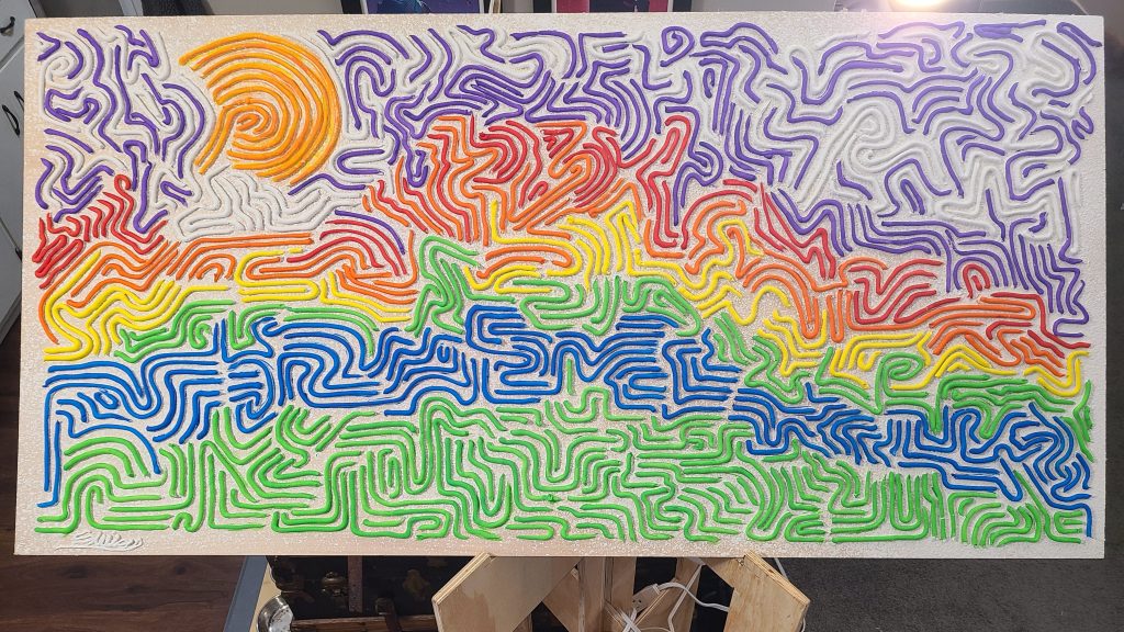 This is my first 2×4’ piece. I didn’t plan for the landscape design. I was trying things out to see how bold lines look on a larger surface. I wanted to test different lengths and turns to see how the overall piece would come together. I remember adding what would become the sun in the end. It was to test semi-circles and to see how I could build off a more defined grouping. This piece was completed over the course of a few days. At some point after adding the sun, and before finishing, I was able to see what was coming through. Once I had the image in my mind I did what I could to put that to form. The painting would be how I would define this piece more than the lines themselves.