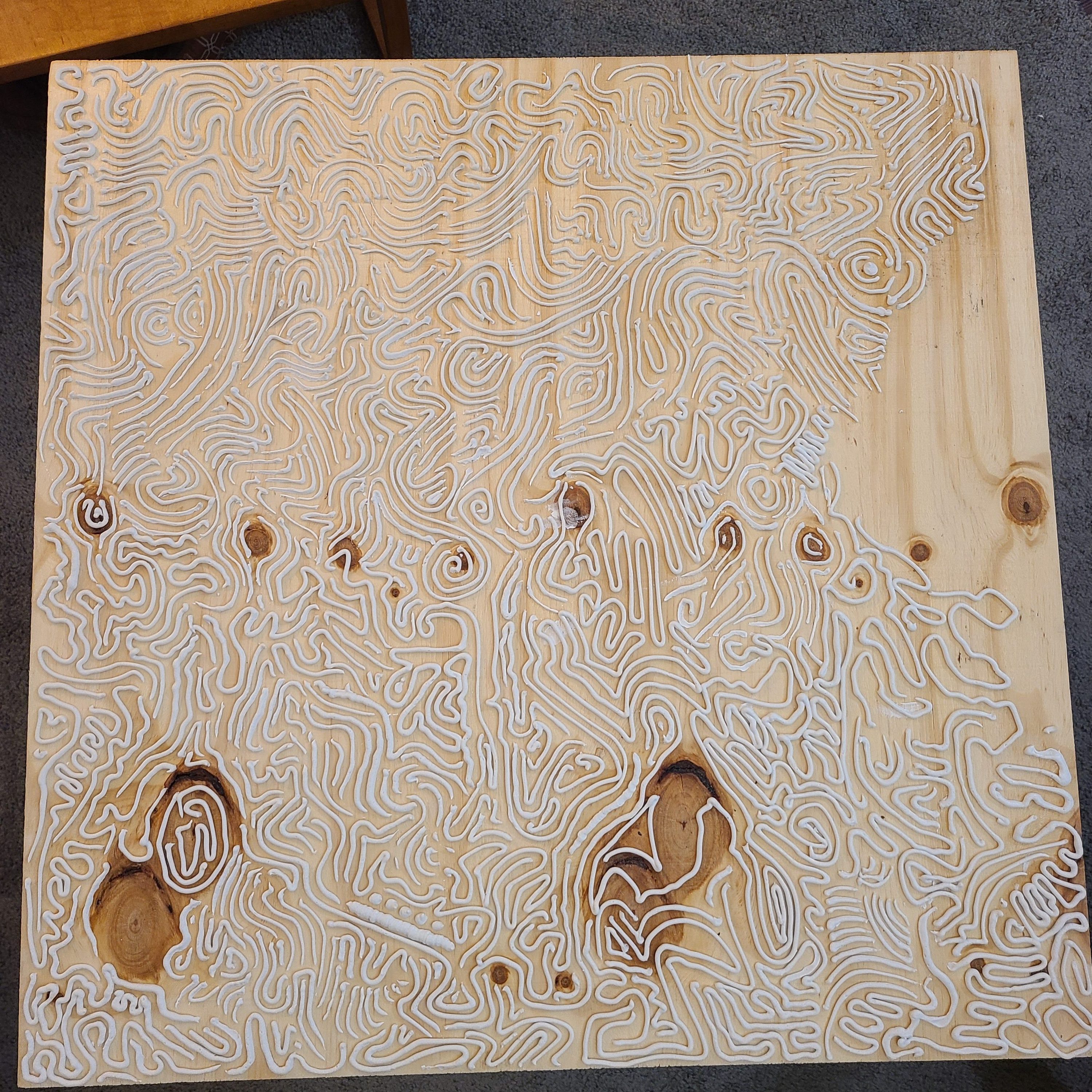 I started putting the lines down and got lost in the process. It was therapeutic in a way. It was like assembling a puzzle without knowing what the pieces were or what the end picture was supposed to be. It was an experiment to see what I could make with the medium and tools. What lines look good, how can I space them, how can I manipulate the piping to change the weight and structure of the lines. I left a blank spot on the board and decided to add the little sun in that spot. The only reason that was there was to try making a sunburst with the paint I had. I’ve always been intrigued by depictions of light and sun, so I wanted to see what crude attempt I could pull off.